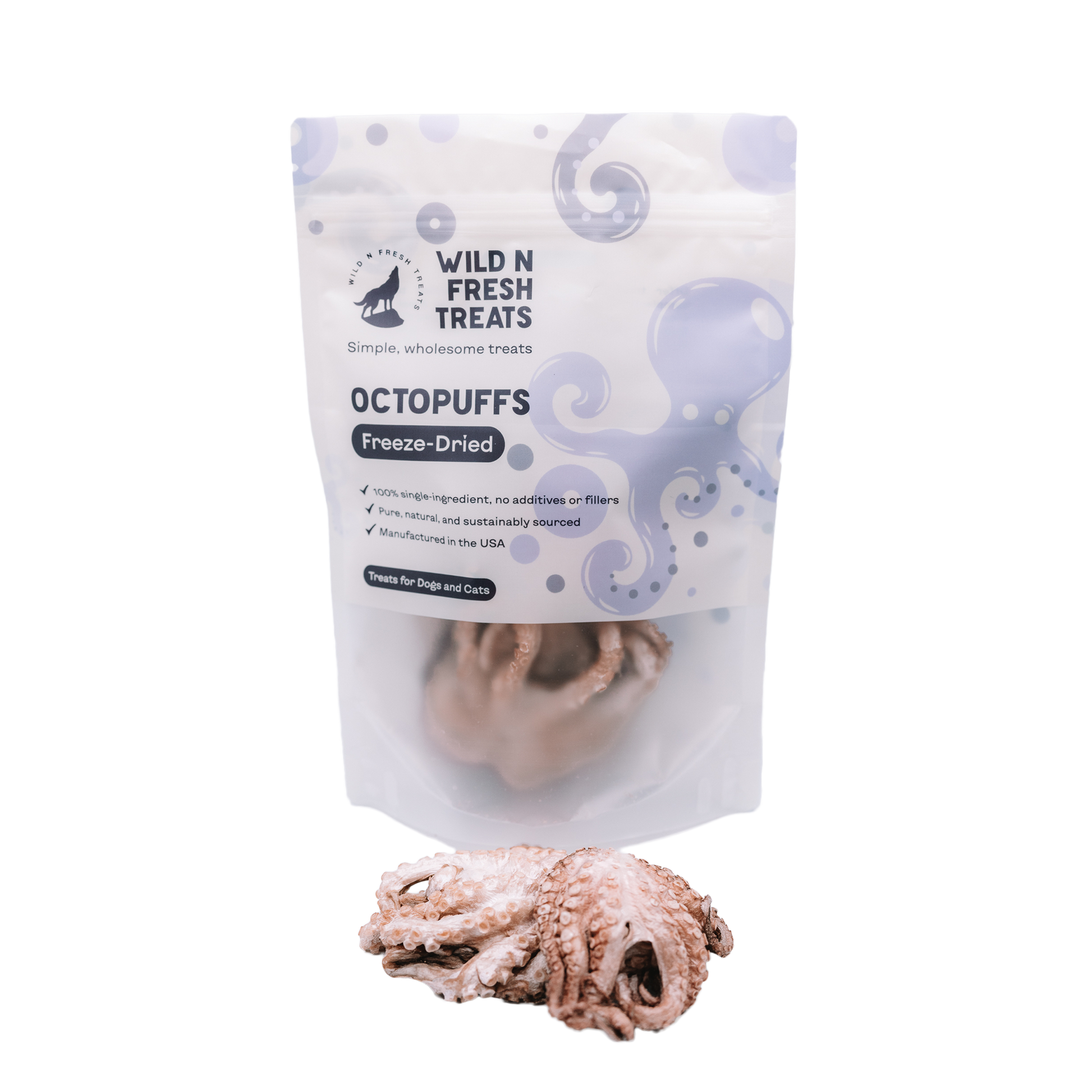 Freeze-Dried Octopuffs (Baby Octopus) A unique seafood snack for adventurous eaters! These Octopuffs are made from wild-caught baby octopus and freeze-dried to lock in flavor and nutrients. Packed with lean protein, taurine, and trace minerals, these crunchy bites are a delicious way to mix up your pet’s treat routine.